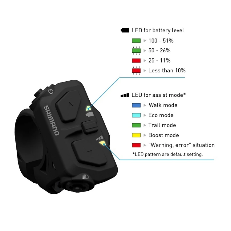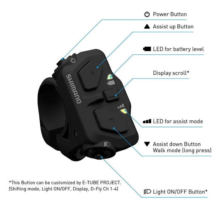 Dieser intuitive Unterstützungsschalter mit integrierter Einschalttaste ist für alle E-Bike-Typen mit Shimano System (EP801/EP600) geeignet und sorgt mit seinem kompakten Design für eine aufgeräumte Optik im Cockpit-Bereich.